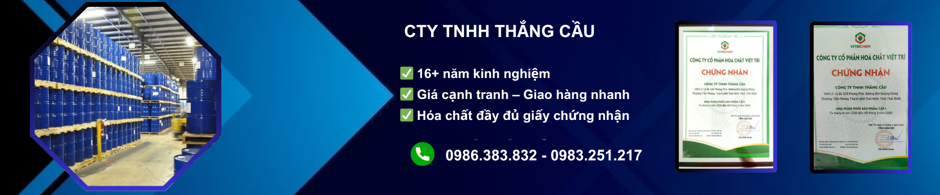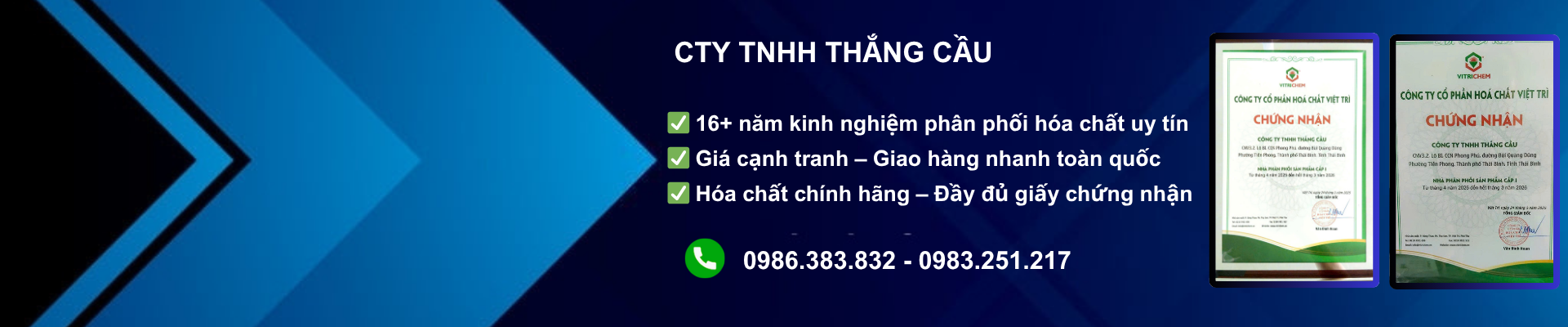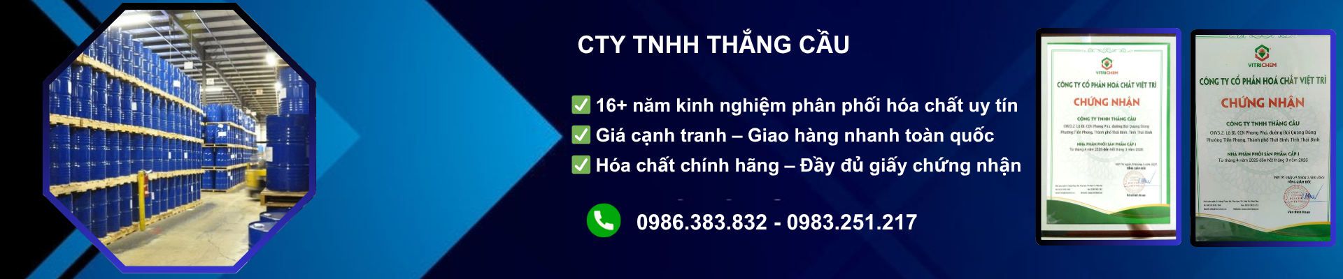 Công ty TNHH Thắng Cầu là Đại lý phân phối chính hãng của Hoá chất Việt Trì trong nhiều năm, chuyên bán lẻ và phân phối các loại hóa chất công nghiệp trên địa bàn tỉnh Thái Bình và các tỉnh miền Bắc Việt Nam.